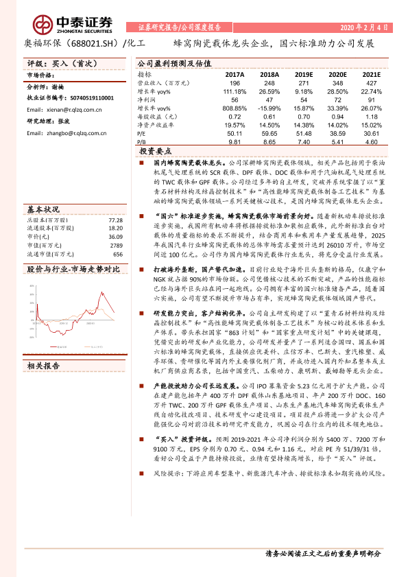 【中泰证券】【20200204】奥福环保-688021.SH-蜂窝陶瓷载体龙头企业,国六标准助力公司发展-24页