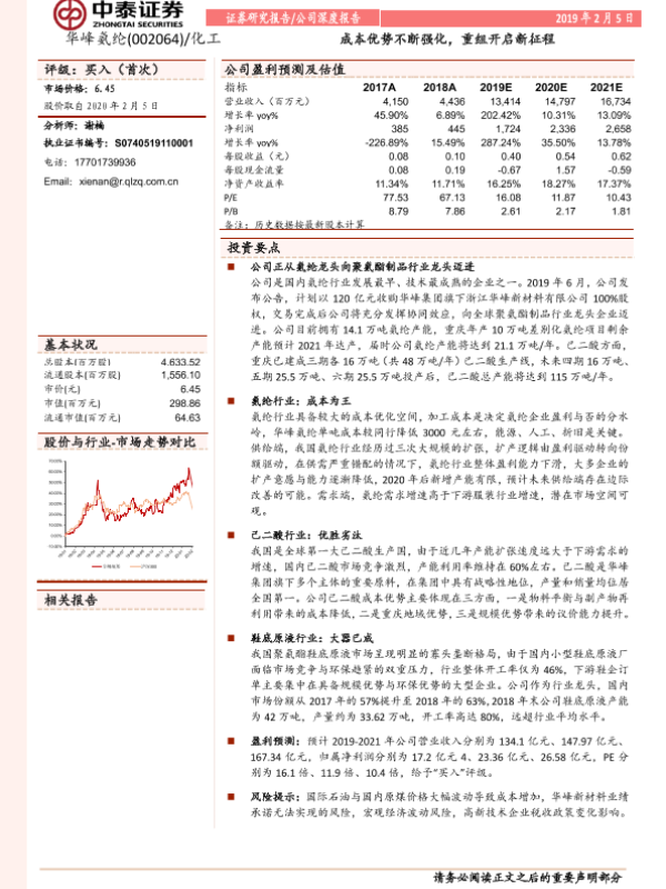 华峰化学 成本优势 氨纶行业 聚氨酯制品 重组并购