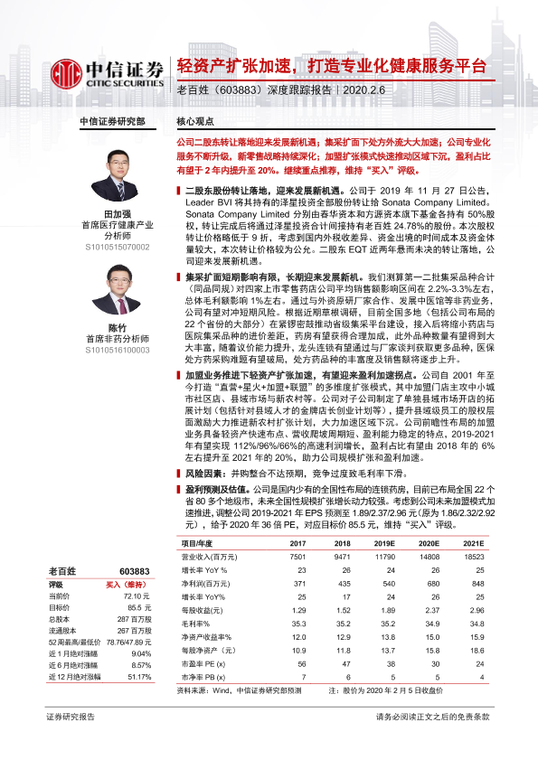 【中信证券】【20200206】20200206-中信证券-老百姓-603883.SH-深度跟踪报告:轻资产扩张加速,打造专业化健康服务平台-23页