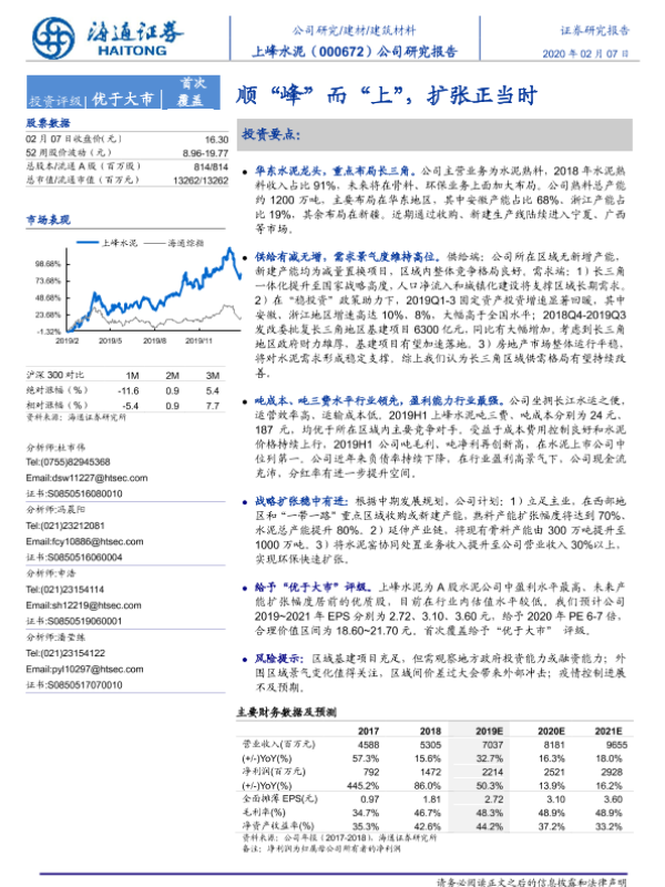上峰水泥 产能扩张 华东市场 水泥行业 财务预测