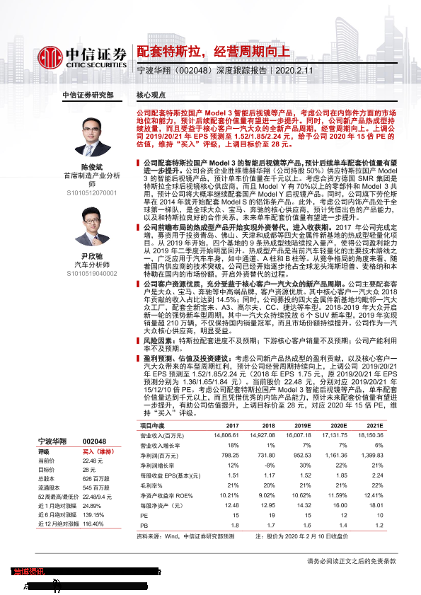 【中信证券】【20200211】配套特斯拉,经营周期向上——宁波华翔(002048.SZ)深度跟踪报告-12页
