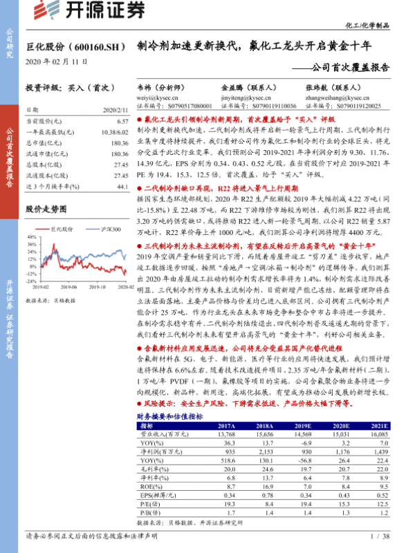 【开源证券】【20200211】巨化股份-公司首次覆盖报告:制冷剂加速更新换代,氟化工龙头开启黄金十年-38页