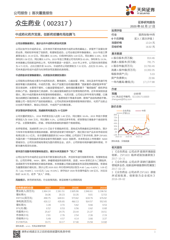 【天风证券】【20200217】20200217-天风证券-众生药业-002317.SZ-中成药化药齐发展,创新药前瞻布局助腾飞-20页