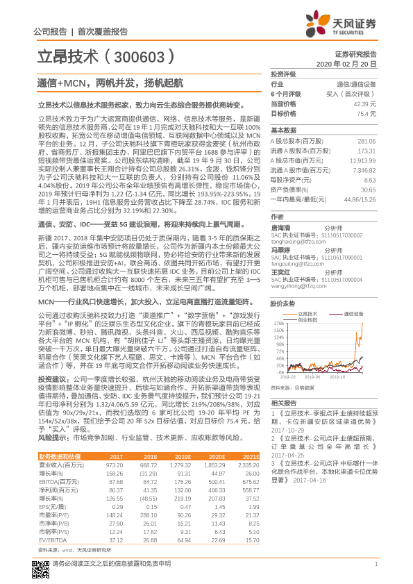 【天风证券】【20200220】20200220-天风证券-立昂技术-300603.SZ-通信+MCN,两帆并发,扬帆起航-32页