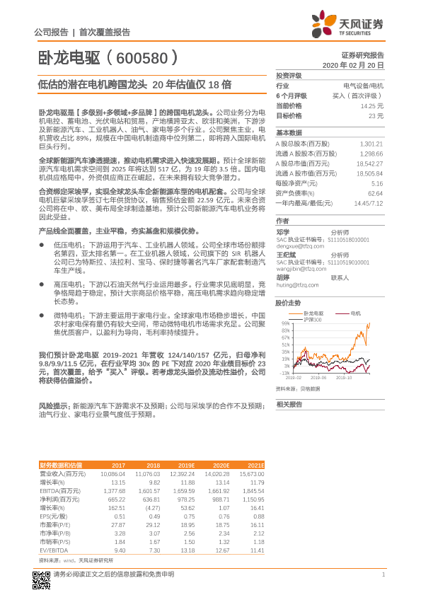 【天风证券】【20200220】低估的潜在电机跨国龙头20年估值仅18倍-29页