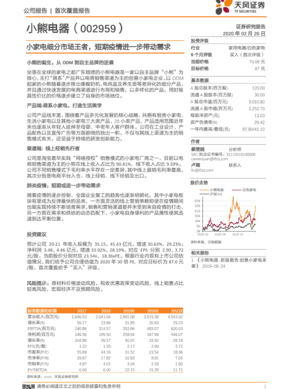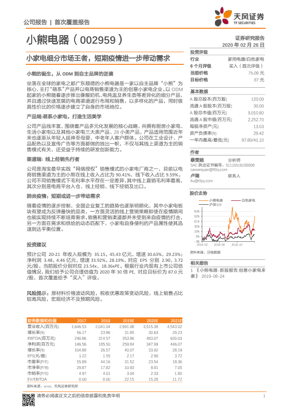 【天风证券】【20200226】小熊电器-002959.SZ-小家电细分市场王者,短期疫情进一步带动需求-25页