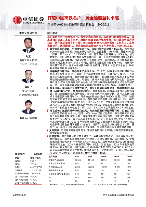 【中信证券】【20200302】20200302-中信证券-京沪高铁-601816.SH-投资价值分析报告:打造中国高铁名片,黄金通道盈利卓越-39页