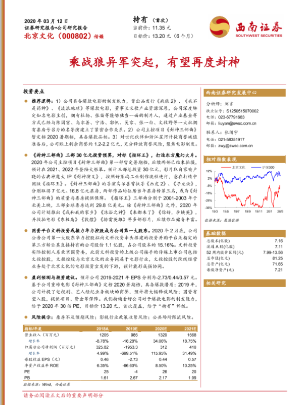 北京文化 封神三部曲 影视制作 电影行业 票房预测