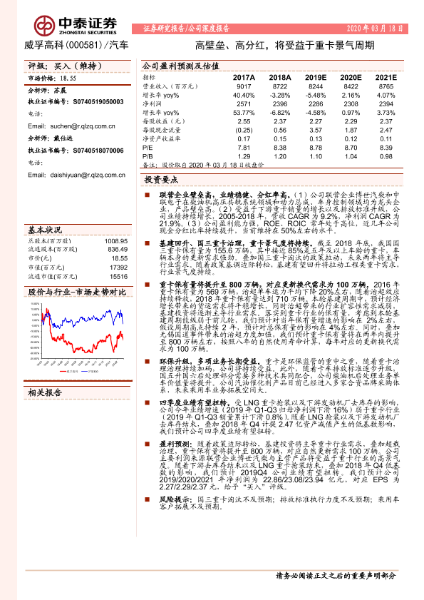 【中泰证券】【20200318】中泰证券-威孚高科-高壁垒、高分红,将受益于重卡景气周期-20页