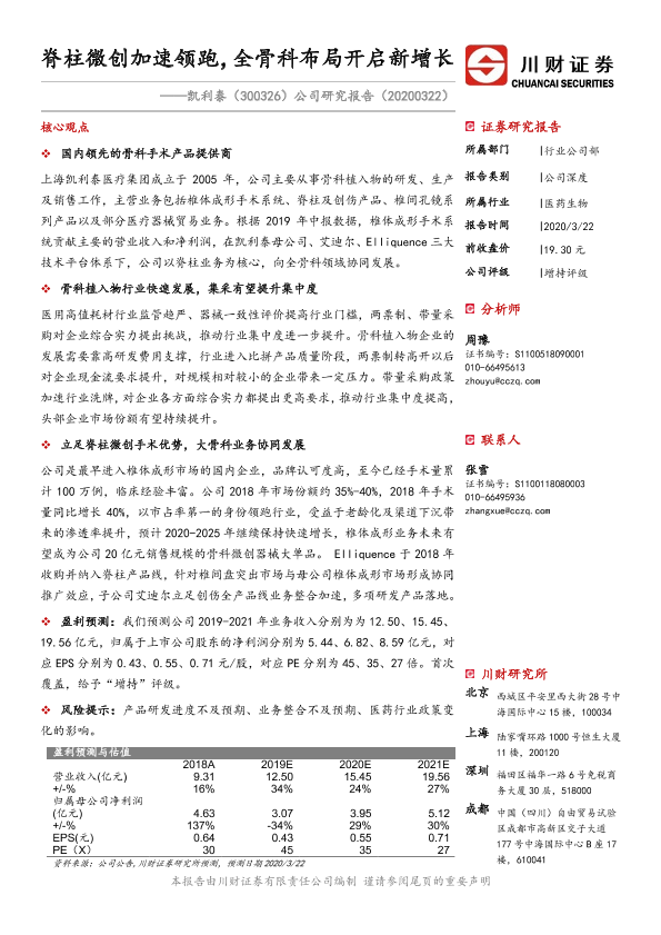 【川财证券】【20200322】凯利泰公司研究报告:脊柱微创加速领跑,全骨科布局开启新增长-31页