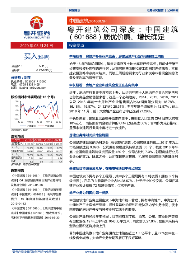 【粤开证券】【20200324】粤开建筑公司深度:中国建筑质优价廉、增长确定-45页