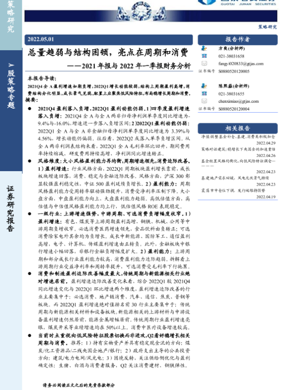 【国泰君安证券】【20220501】2021年报与2022年一季报财务分析:总量趋弱与结构困顿,亮点在周期和消费-20页