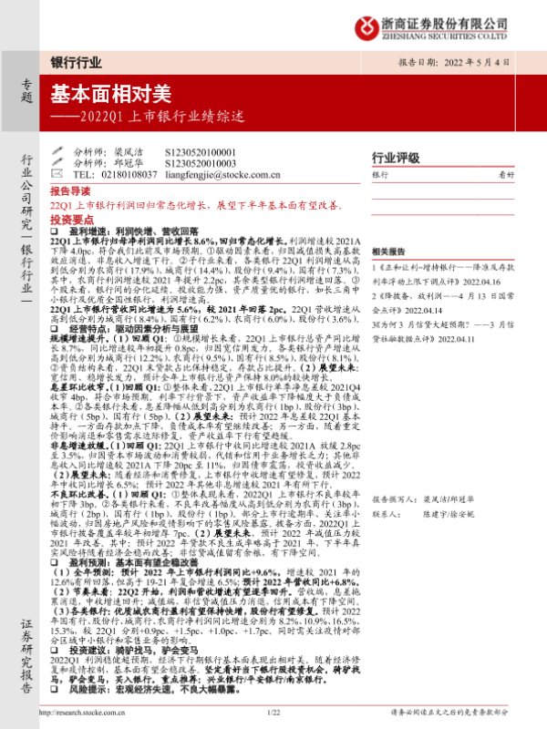 【浙商证券】【20220504】2022Q1上市银行业绩综述:基本面相对美-22页