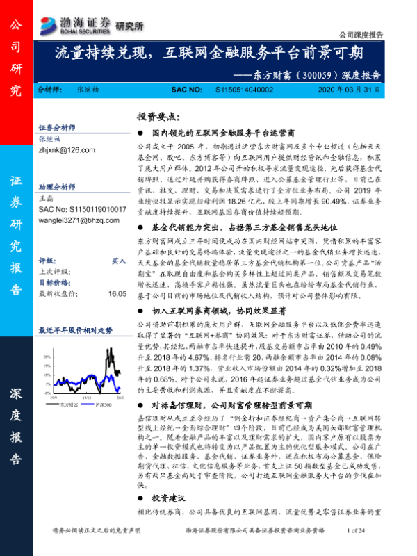 【渤海证券】【20200331】20200331-渤海证券-东方财富-300059.SZ-深度报告:流量持续兑现,互联网金融服务平台前景可期-24页