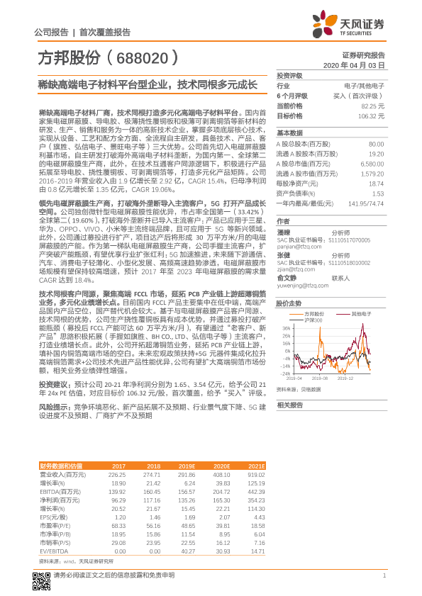 【天风证券】【20200403】20200403-天风证券-方邦股份-688020.SH-稀缺高端电子材料平台型企业,技术同根多元成长-20页