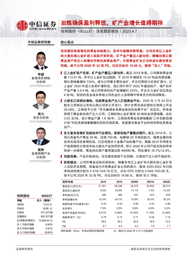 【中信证券】【20200407】20200407-中信证券-恒邦股份-002237.SZ-深度跟踪报告:冶炼确保盈利释放,矿产金增长值得期待-29页