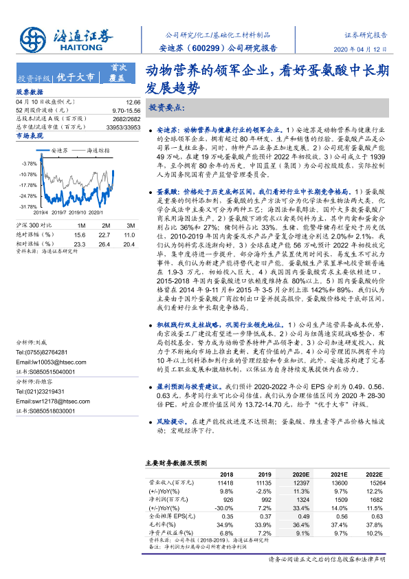 【海通证券】【20200412】20200412-海通证券-安迪苏-600299.SH-公司研究报告:动物营养的领军企业,看好蛋氨酸中长期发展趋势-24页
