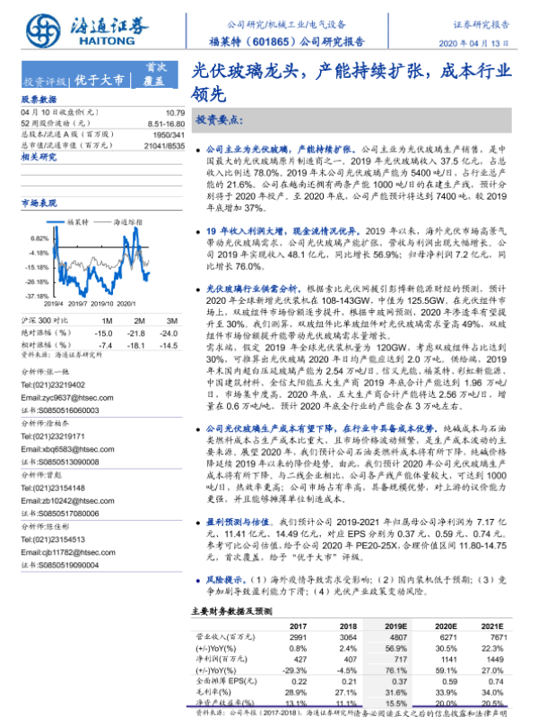 【海通证券】【20200413】福莱特-601865.SH-公司研究报告:光伏玻璃龙头,产能持续扩张,成本行业领先-20页