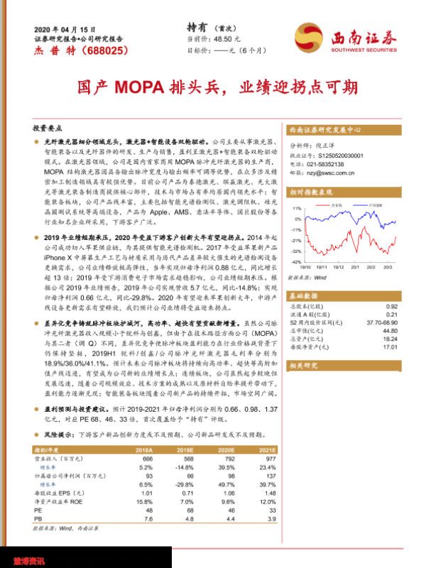 【西南证券】【20200415】国产MOPA排头兵,业绩迎拐点可期-21页