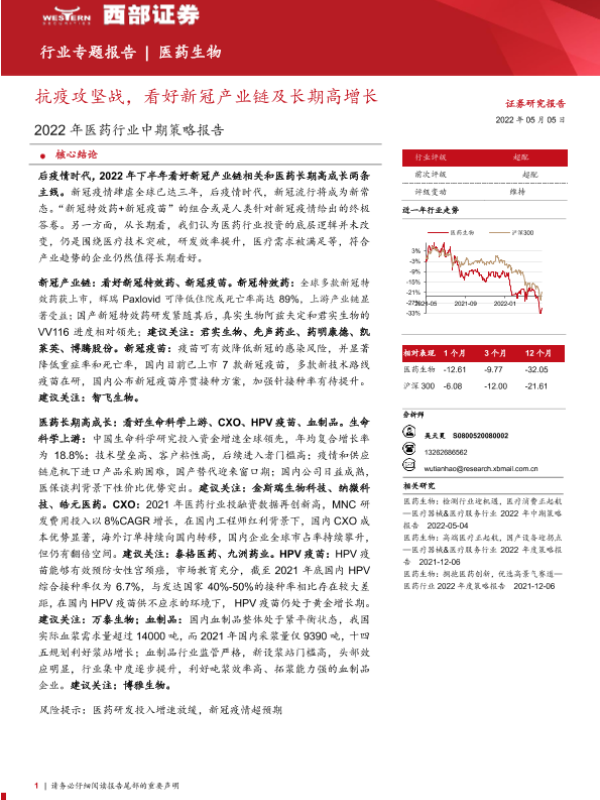 【西部证券】【20220505】2022年医药行业中期策略报告:抗疫攻坚战,看好新冠产业链及长期高增长-53页