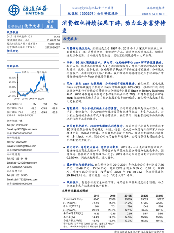 【海通证券】【20200416】欣旺达-300207.SZ-公司研究报告:消费锂电持续拓展下游,动力业务蓄势待发-24页