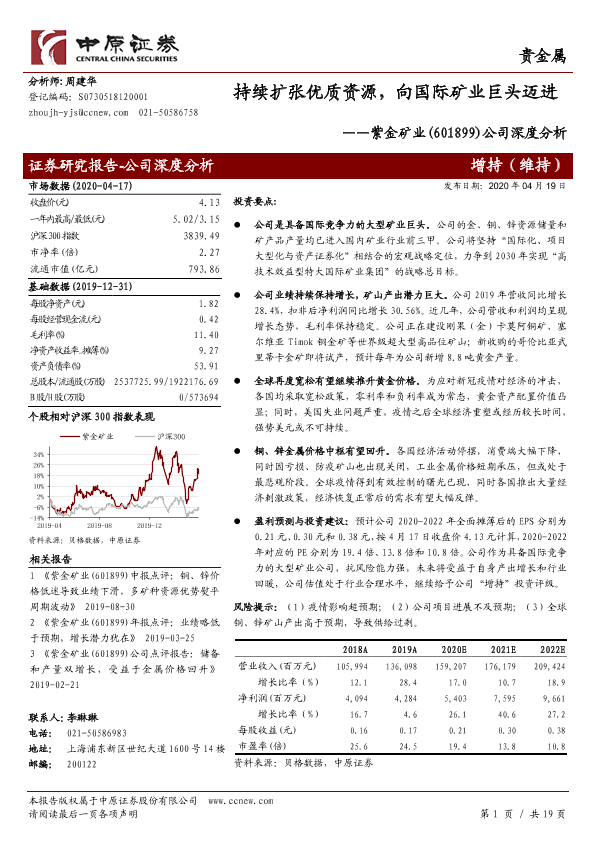 【中原证券】【20200419】紫金矿业-601899.SH-公司深度分析:持续扩张优质资源,向国际矿业巨头迈进-19页