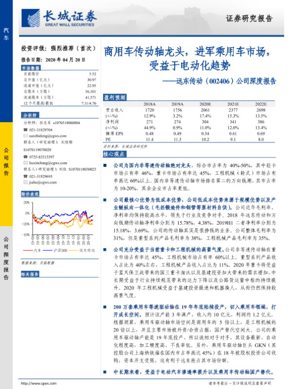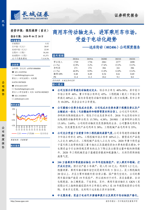 【长城证券】【20200420】20200420-长城证券-远东传动-002406.SZ-公司深度报告:商用车传动轴龙头,进军乘用车市场,受益于电动化趋势-37页