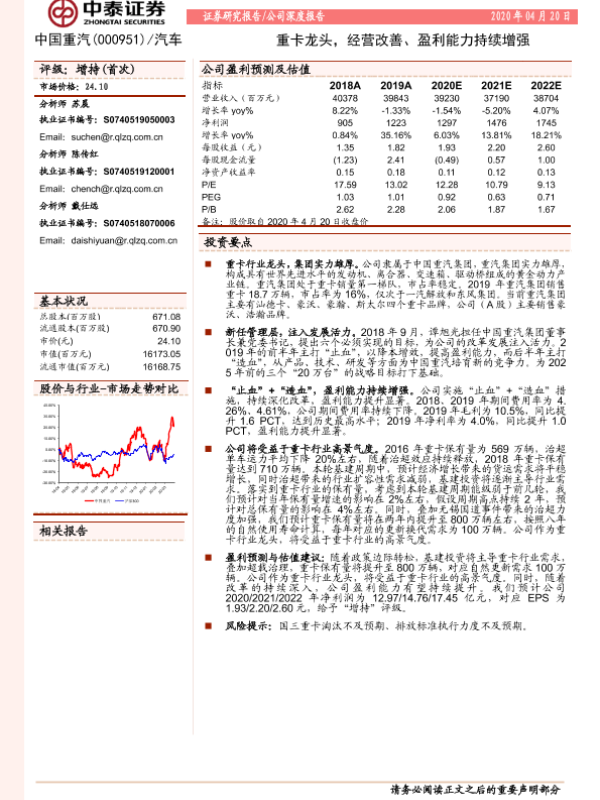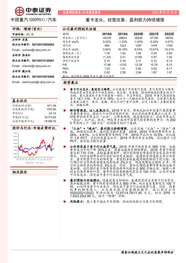 【中泰证券】【20200420】中国重汽-000951.SZ-重卡龙头,经营改善,盈利能力持续增强-20页