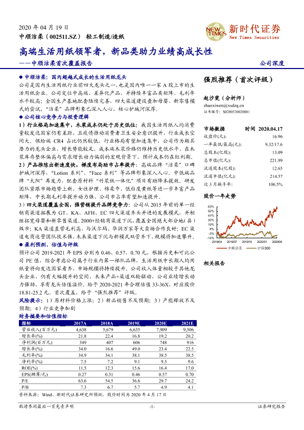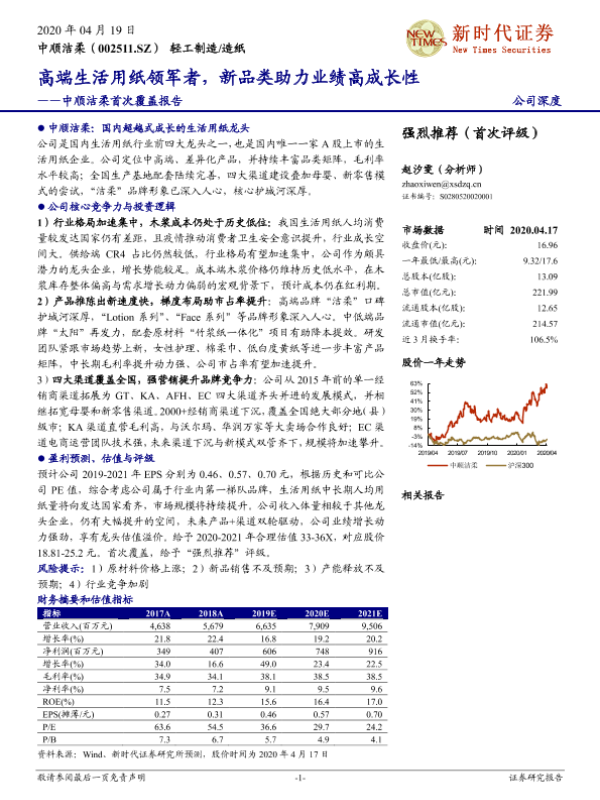 【新时代证券】【20200419】中顺洁柔首次覆盖报告:高端生活用纸领军者,新品类助力业绩高成长性-32页