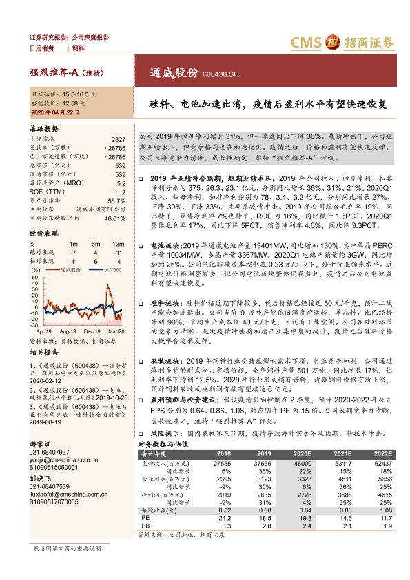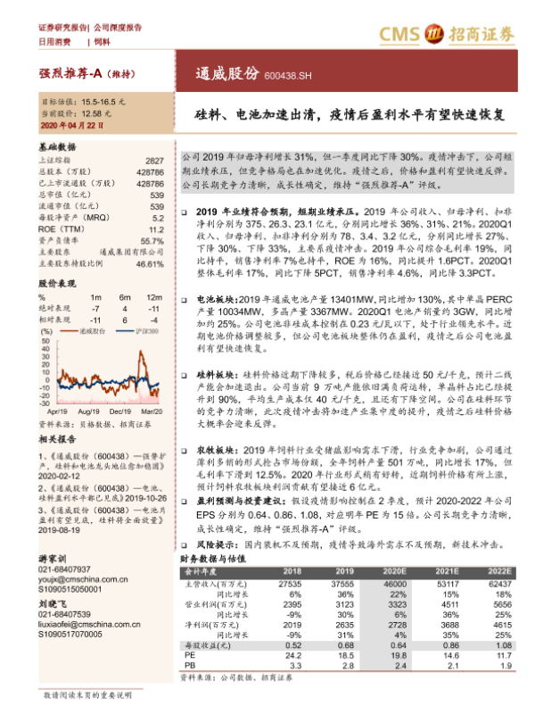 光伏产业 疫情冲击 盈利预测 硅料电池 通威股份
