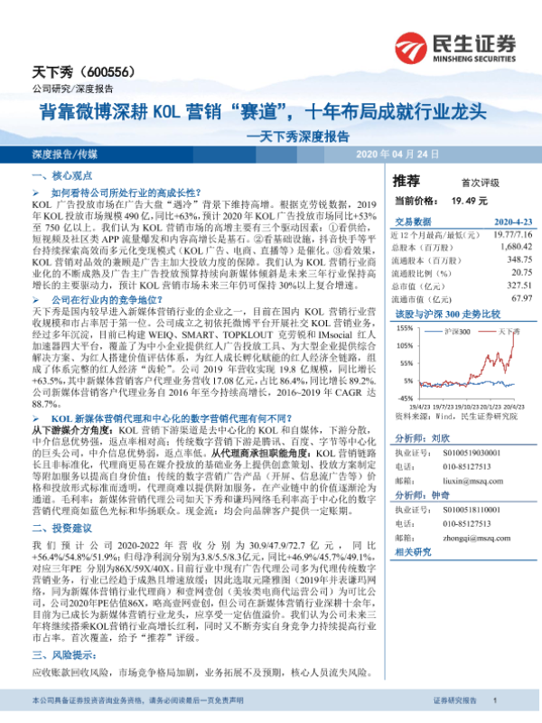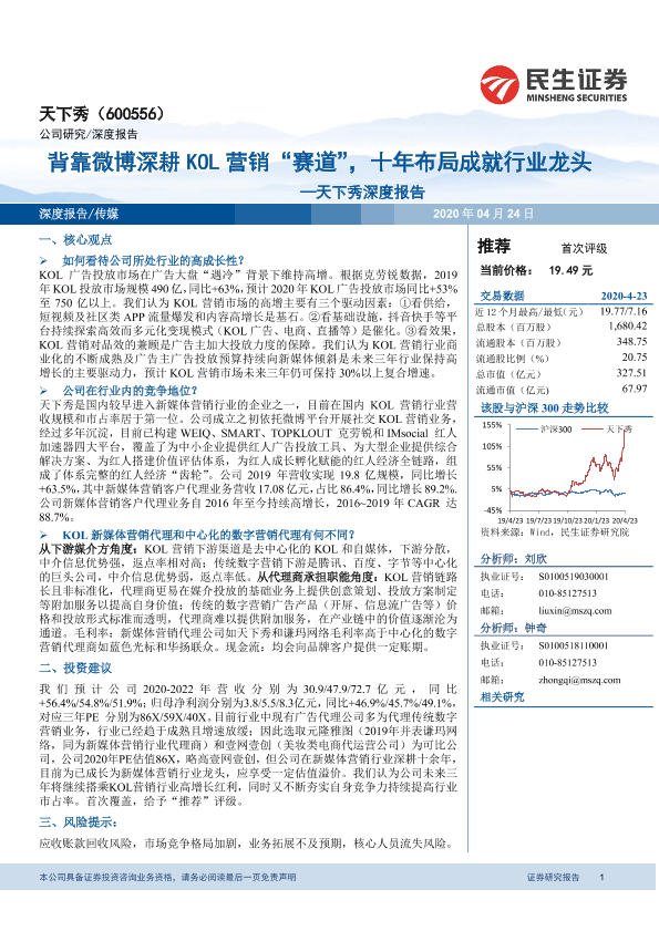 【民生证券】【20200424】20200424-民生证券-天下秀-600556.SH-天下秀深度报告:背靠微博深耕KOL营销“赛道”,十年布局成就行业龙头-40页