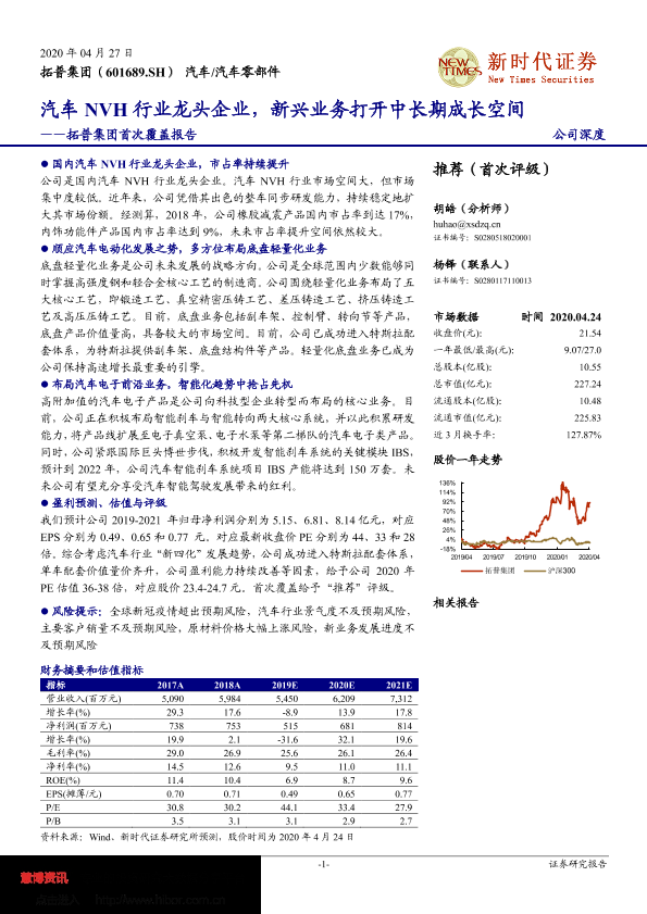 【新时代证券】【20200427】拓普集团首次覆盖报告:汽车NVH行业龙头企业,新兴业务打开中长期成长空间-29页