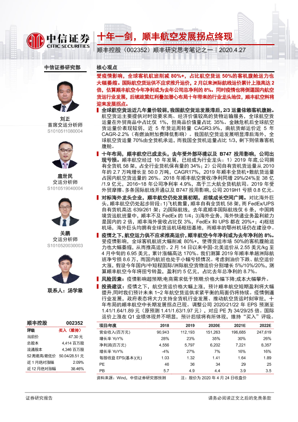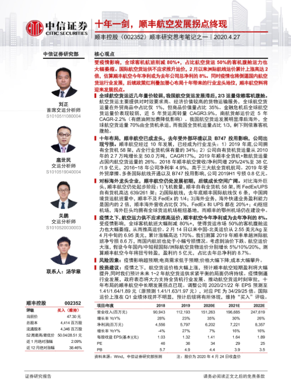 【中信证券】【20200427】20200427-中信证券-顺丰控股-002352.SZ-顺丰研究思考笔记之一:十年一剑,顺丰航空发展拐点终现-36页