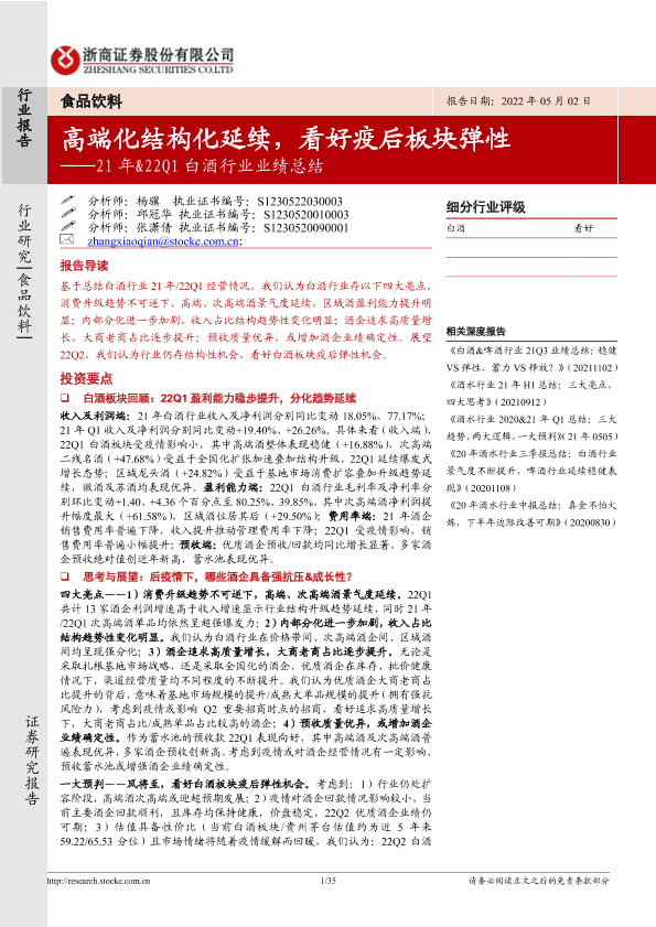 【浙商证券】【20220502】21年&22Q1白酒行业业绩总结:高端化结构化延续,看好疫后板块弹性-35页