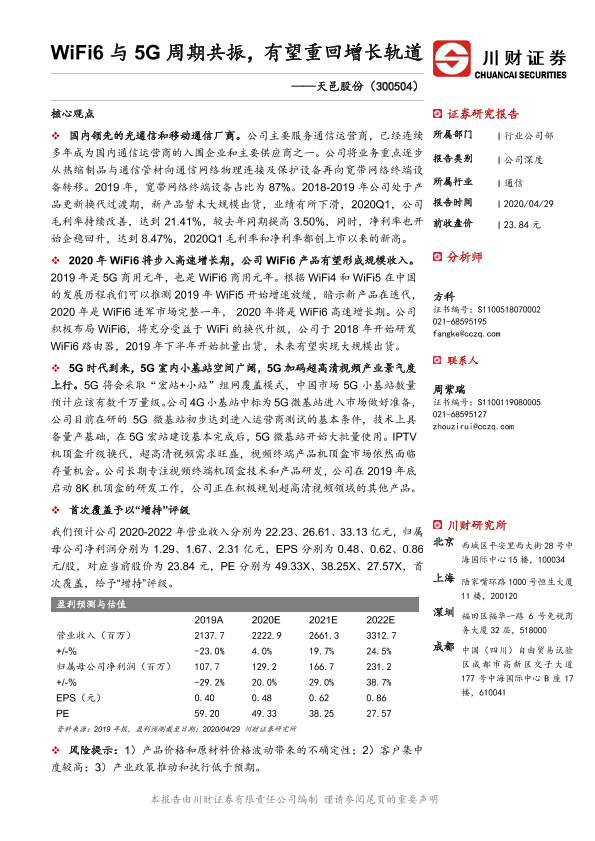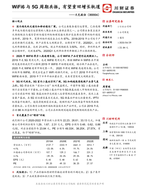 【川财证券】【20200429】WiFi6与5G周期共振,有望重回增长轨道-26页