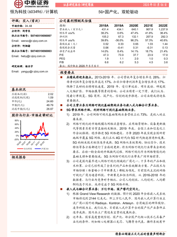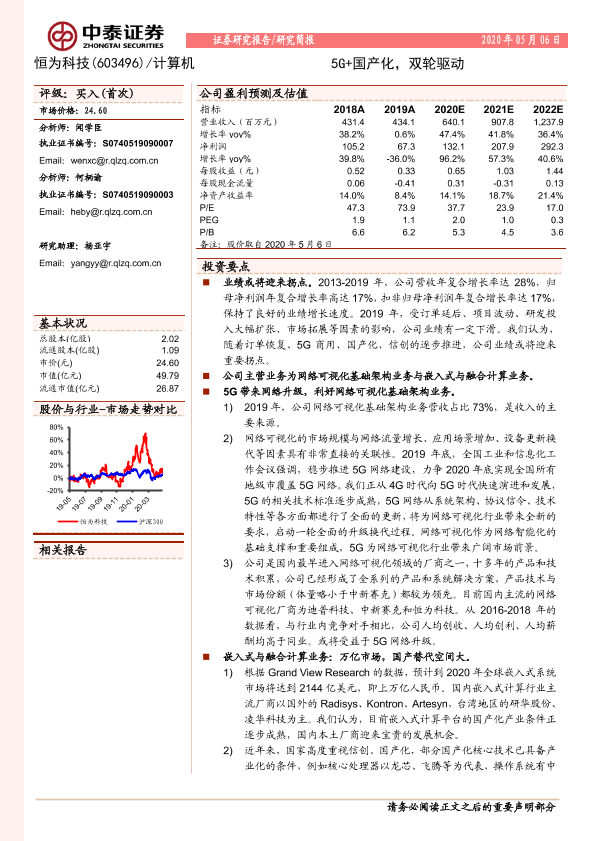 【中泰证券】【20200506】20200506-中泰证券-恒为科技-603496.SH-5G+国产化,双轮驱动-20页