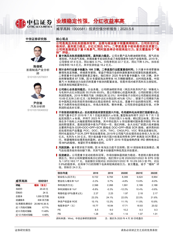 【中信证券】【20200506】20200506-中信证券-威孚高科-000581.SZ-投资价值分析报告:业绩稳定性强,分红收益率高-20页