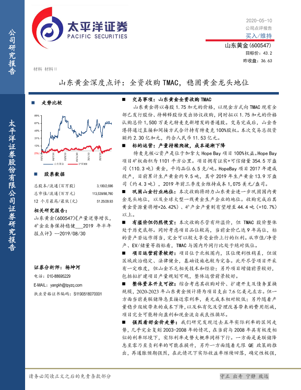 【太平洋证券】【20200510】山东黄金深度点评:全资收购TMAC,稳固黄金龙头地位-13页