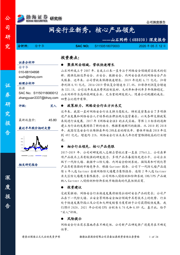 【渤海证券】【20200512】网安行业新秀,核心产品领先——山石网科(688030)深度报告-24页