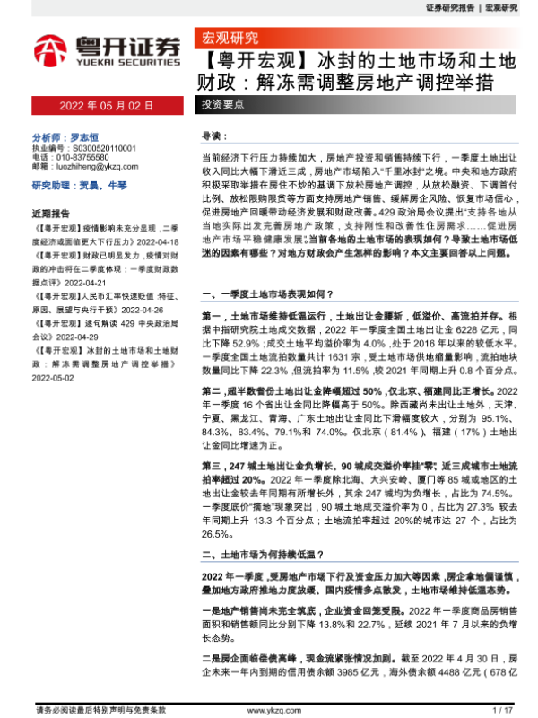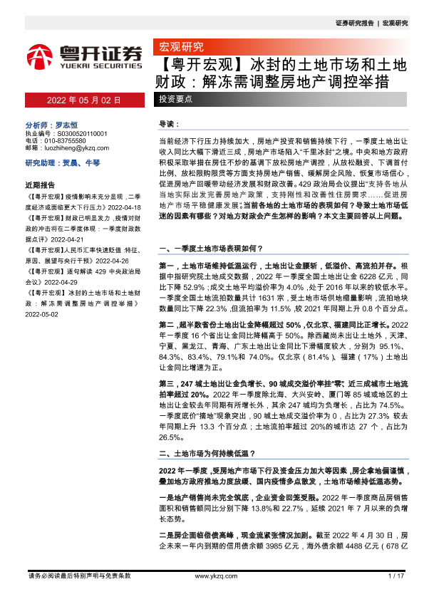 【粤开证券】【20220502】【粤开宏观】冰封的土地市场和土地财政:解冻需调整房地产调控举措-17页