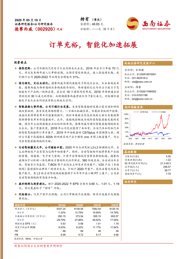 【西南证券】【20200519】德赛西威-002920.SZ-订单充裕,智能化加速拓展-35页