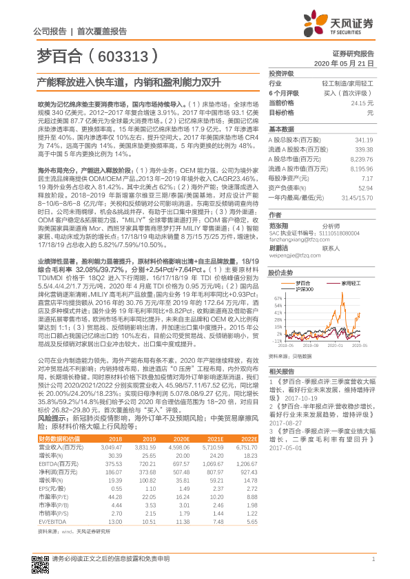 产能释放 内销增长 梦百合 盈利能力提升 记忆绵床垫