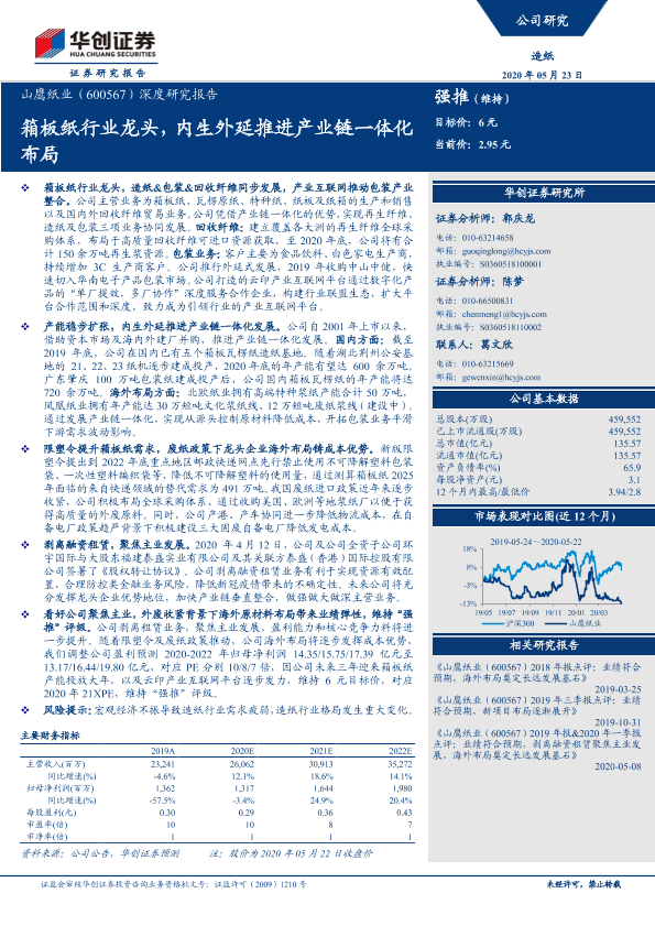【华创证券】【20200523】20200523-华创证券-山鹰国际-600567.SH-深度研究报告:箱板纸行业龙头,内生外延推进产业链一体化布局-31页