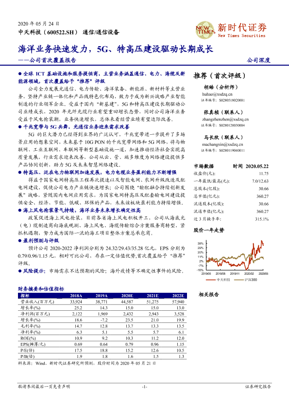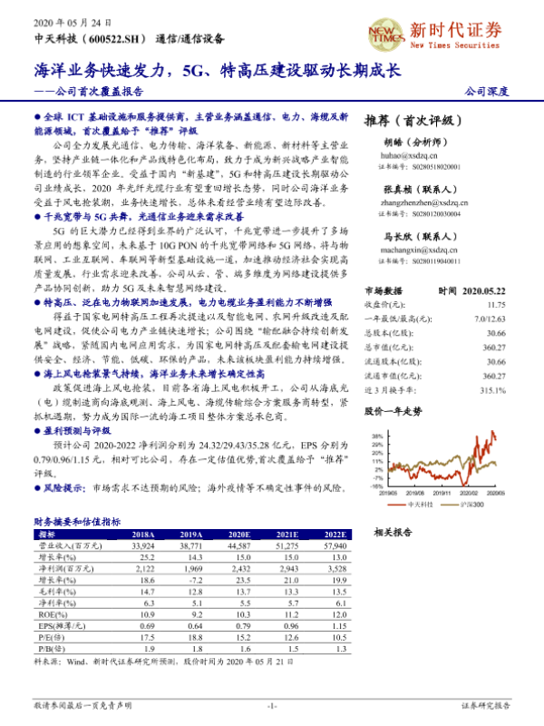【新时代证券】【20200524】中天科技-600522.SH-公司首次覆盖报告:海洋业务快速发力,5G、特高压建设驱动长期成长-24页