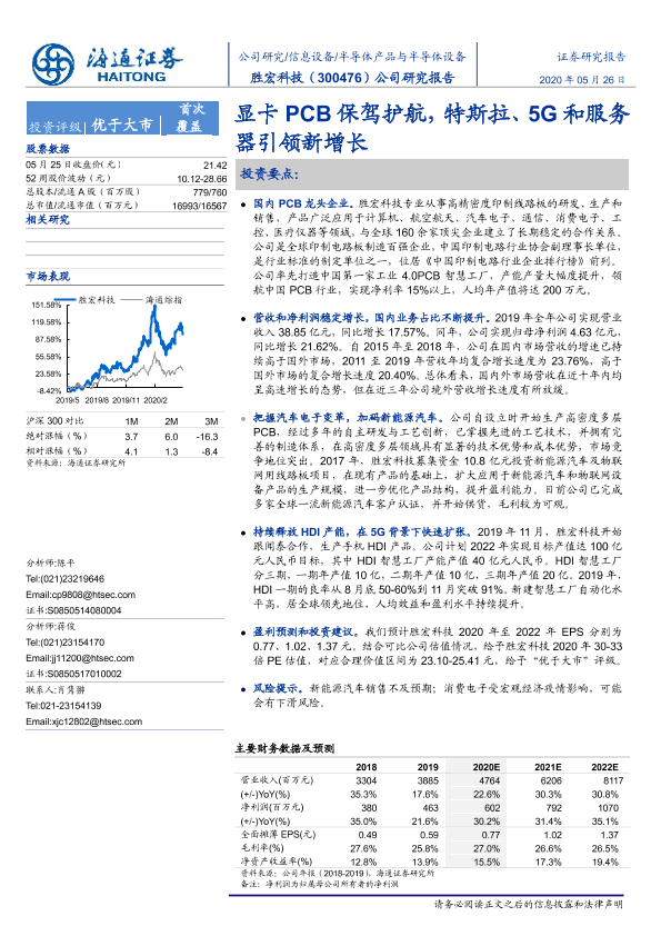 【海通证券】【20200526】胜宏科技-300476.SZ-公司研究报告:显卡PCB保驾护航,特斯拉、5G和服务器引领新增长-33页