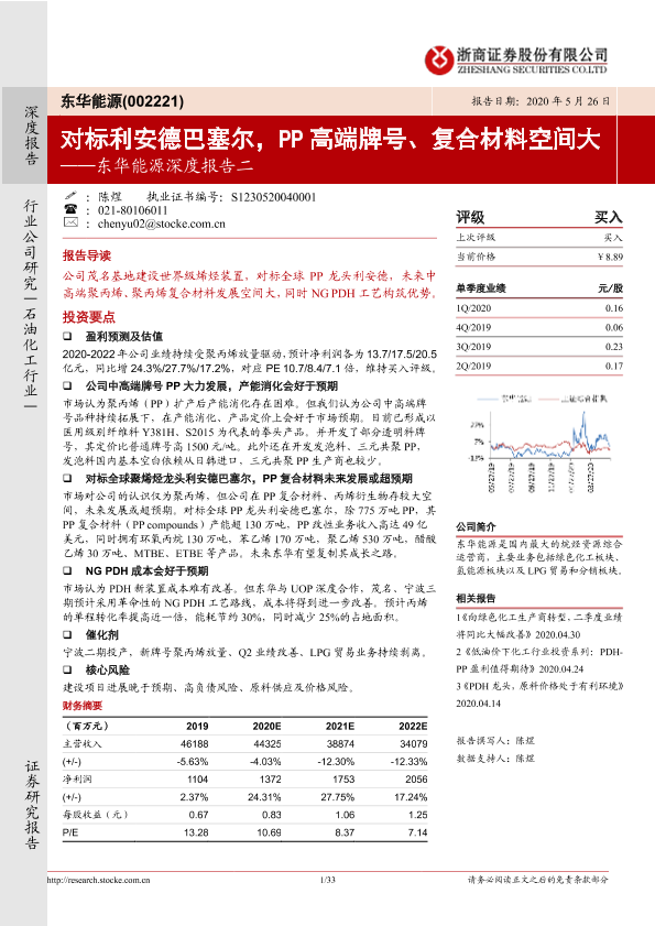 【浙商证券】【20200526】东华能源深度报告二:对标利安德巴塞尔,PP高端牌号、复合材料空间大-33页