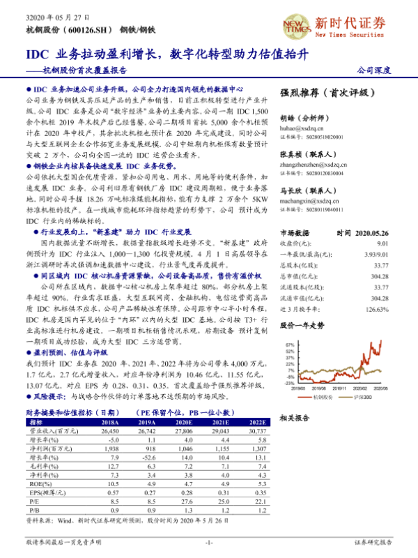【新时代证券】【20200527】杭钢股份首次覆盖报告:IDC业务拉动盈利增长,数字化转型助力估值抬升-33页