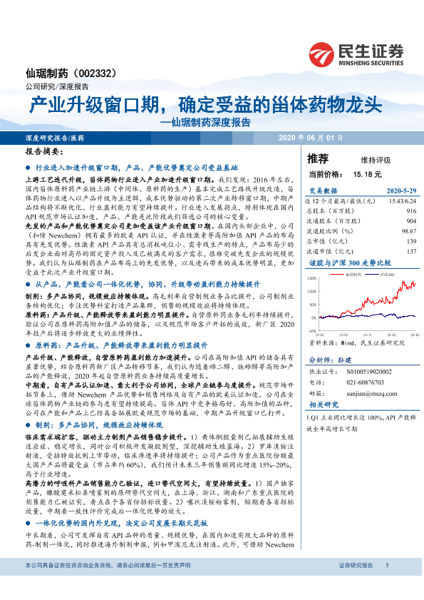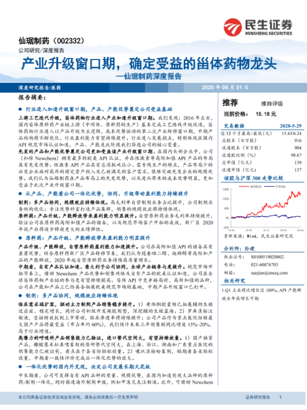 【民生证券】【20200601】仙琚制药深度报告:产业升级窗口期,确定受益的甾体药物龙头-30页
