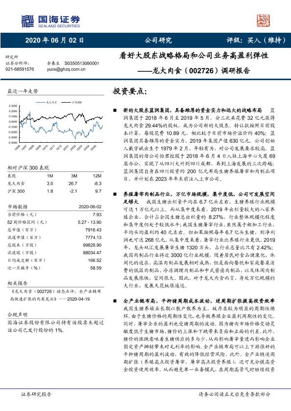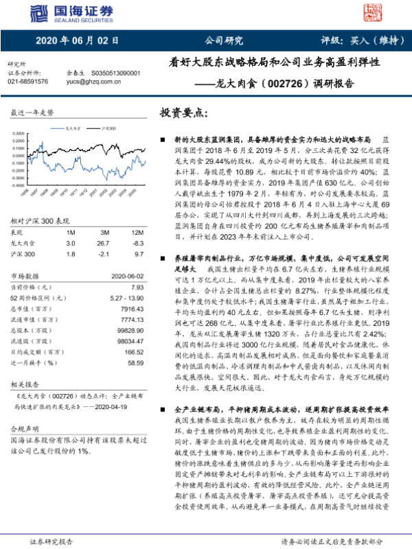 【国海证券】【20200602】看好大股东战略格局和公司业务高盈利弹性——龙大肉食(002726)调研报告-22页