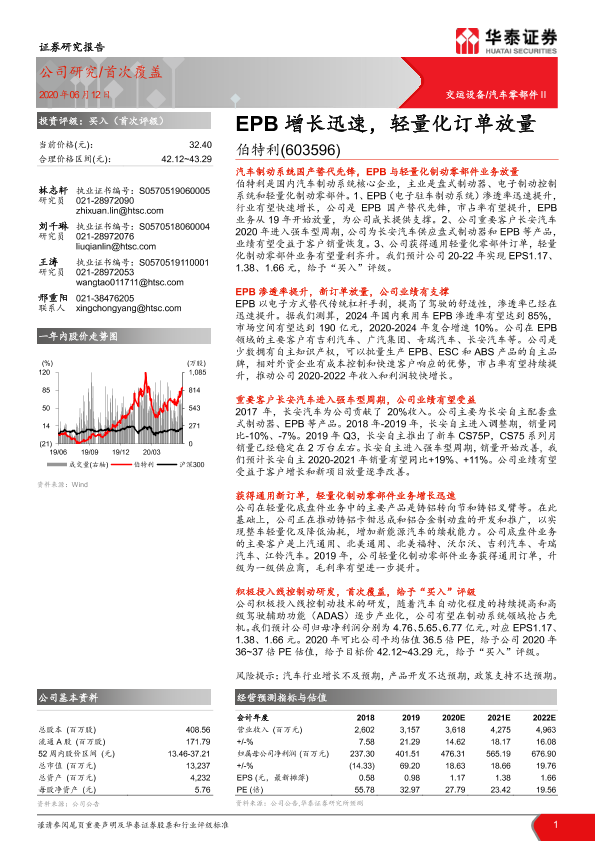 【华泰证券】【20200612】EPB增长迅速,轻量化订单放量-23页